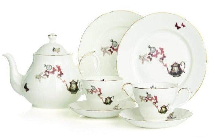 French Swirl Porcelain 14 pcs Tea Set for 6 with Tea Tray & Spoons
