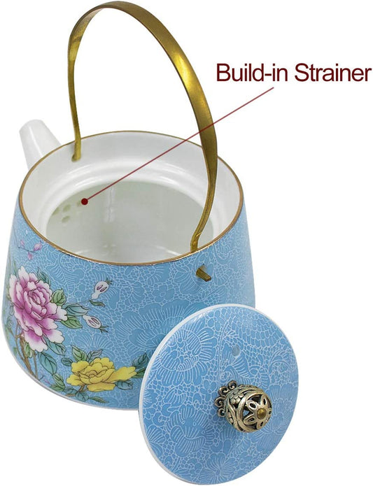 Dahlia Prosperity Peony Exquisite Filigree Porcelain Gongfu Tea Set (Teapot + 6 Teacups) Light Blue