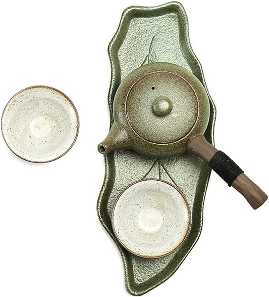 Japanese Coarse Pottery Green Tea Set With Leaf Tray And 2 Tea Cups, Gift Box. 日本茶セット
