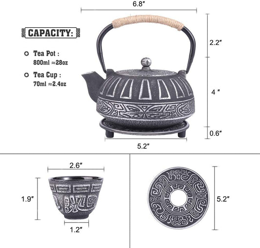 Japanese Style Cast Iron Teapot with 4 Tea Cups Trivet Tetsubin Tea Kettle with Infuser Chinese Tea Set for Adults Iron Tea Pots Black (Magpie and Plum Pattern)