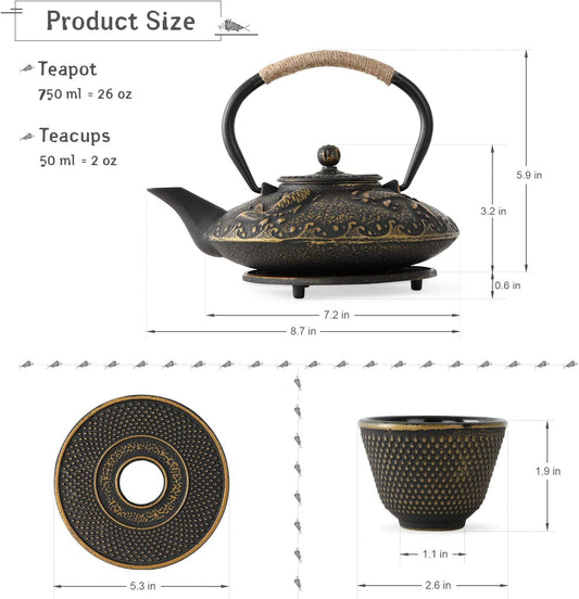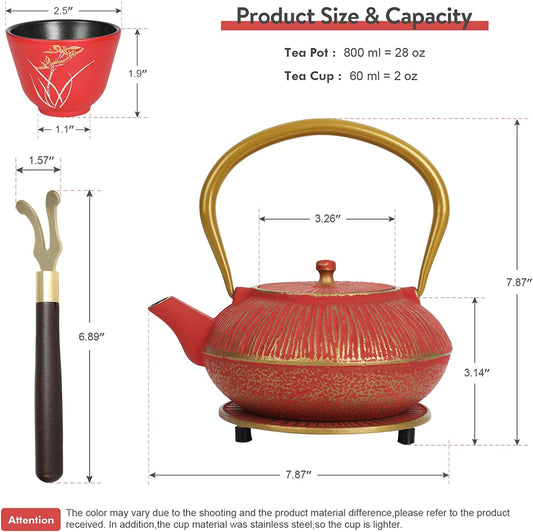 Dragonfly Cast Iron Teapot Set with 2 Cups 27oz Red
