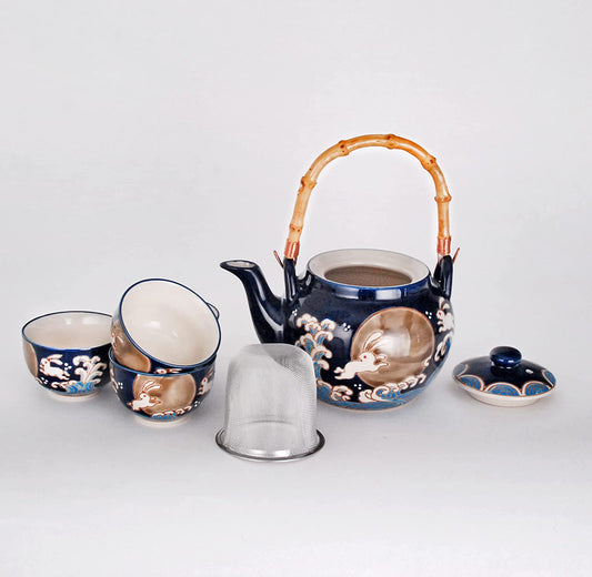 Hinomaru Collection Japanese Style Moon Rabbit Design 25 fl oz Ceramic Teapot with Rattan Handle and 4 Tea Cups Set