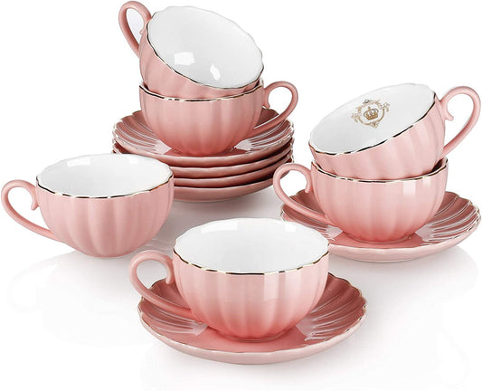 Amazingware Royal Tea Cups and Saucers, with Gold Trim and Gift Box, British Coffee Cups, Porcelain Tea Set, Set of 6 (8 oz)- White
