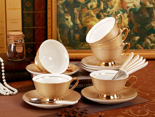 Jusalpha® Porcelain Tea Set-Golden Brown Tea Cup and Saucer Coffee Cup Set with Spoon FD-TCS09 (Set of 6)