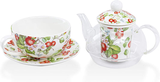 Grace Teaware 5-Piece Glass Porcelain 13-Ounce Tea For One With Infuser (Floral Strawberry Field)