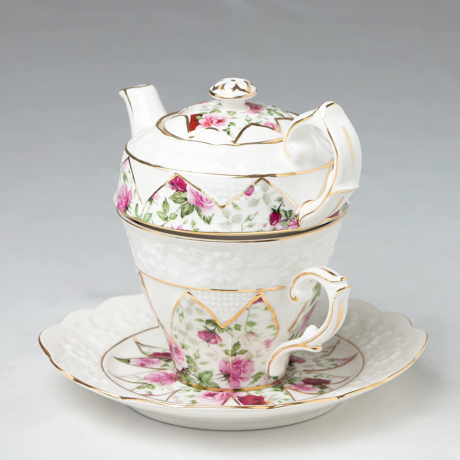 Gracie China by Coastline Imports 4-Piece Porcelain Tea for One, Stacked Teapot Cup Saucer, Red Rose