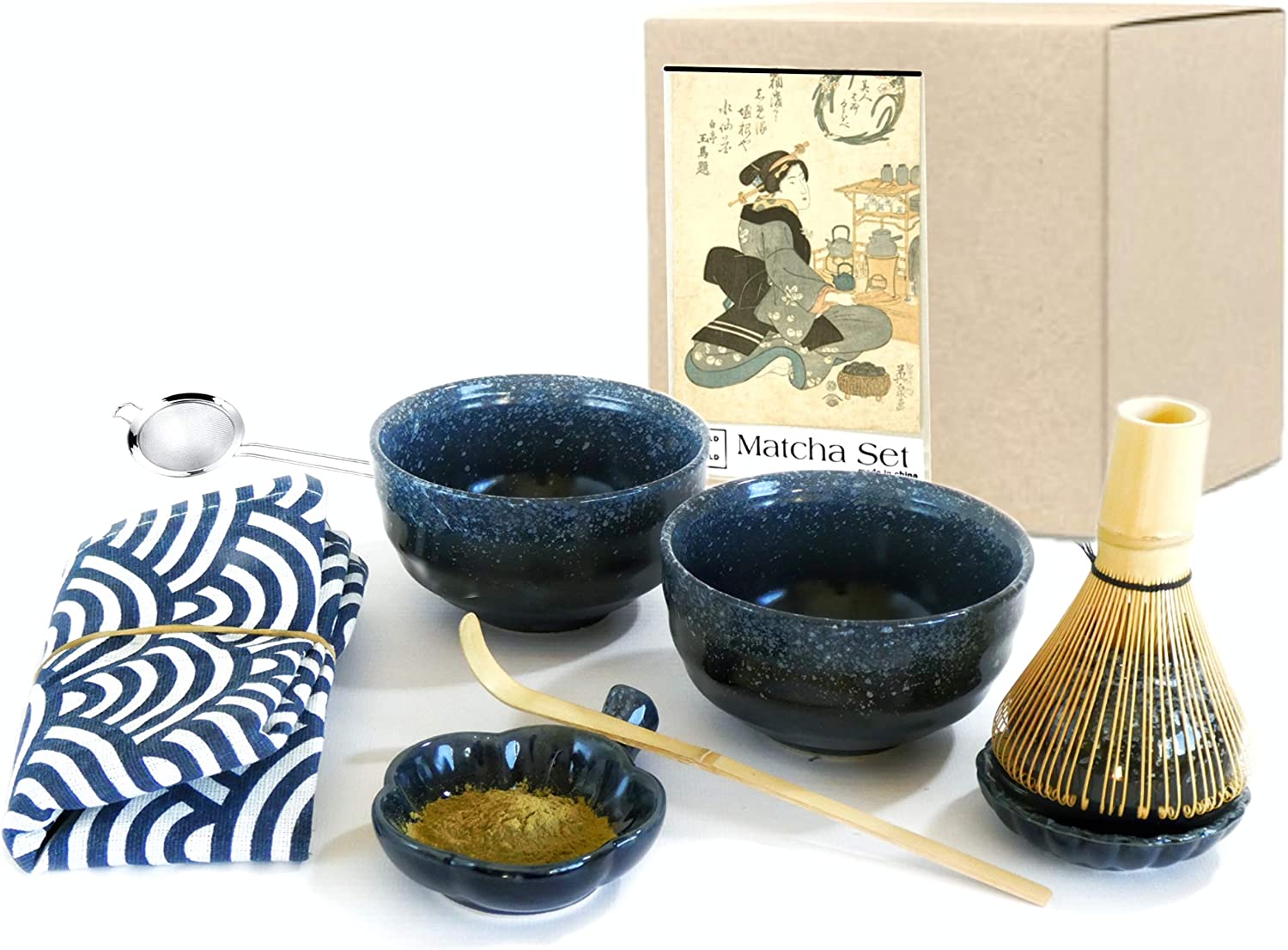 Harold & Harold Complete 9 pieces Matcha Tea Set With Exclusive Japanese style Bamboo Chasen with anti drip. NEW 2022 Emerald Pattern. Enjoy H&H Traditional set now in a new combinations of color. H&H Matcha sets are produced following the highest quality standards. Carefully selected ceramic, hand-crafted bamboo whisker, stainless steel strainer; all packed very carefully in a strong protective package to make sure it arrives in perfect conditions. Perfect for Matcha Latte, Green Tea Matcha and other variations. 9 pieces Set - 2 Ceramic cups, Bamboo Whisk (Chasen) and Hooked Bamboo Scoop (Chashaku), Chasen holder and dripping plate, tea recipient, strainer and tea cloth Enjoy your Matcha!