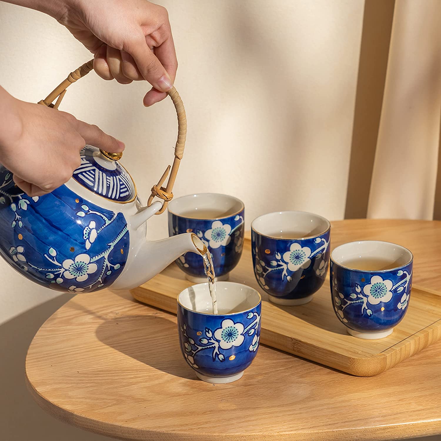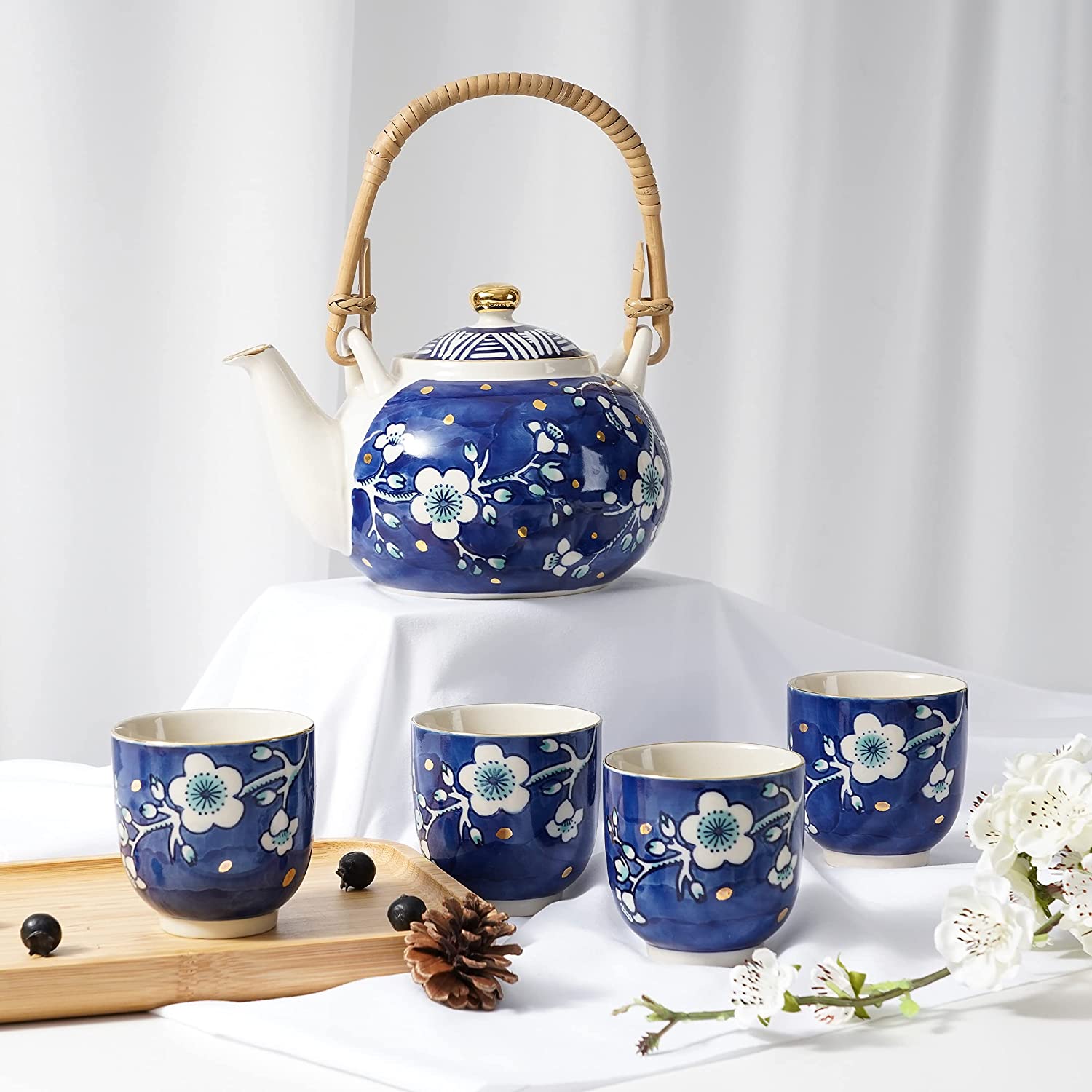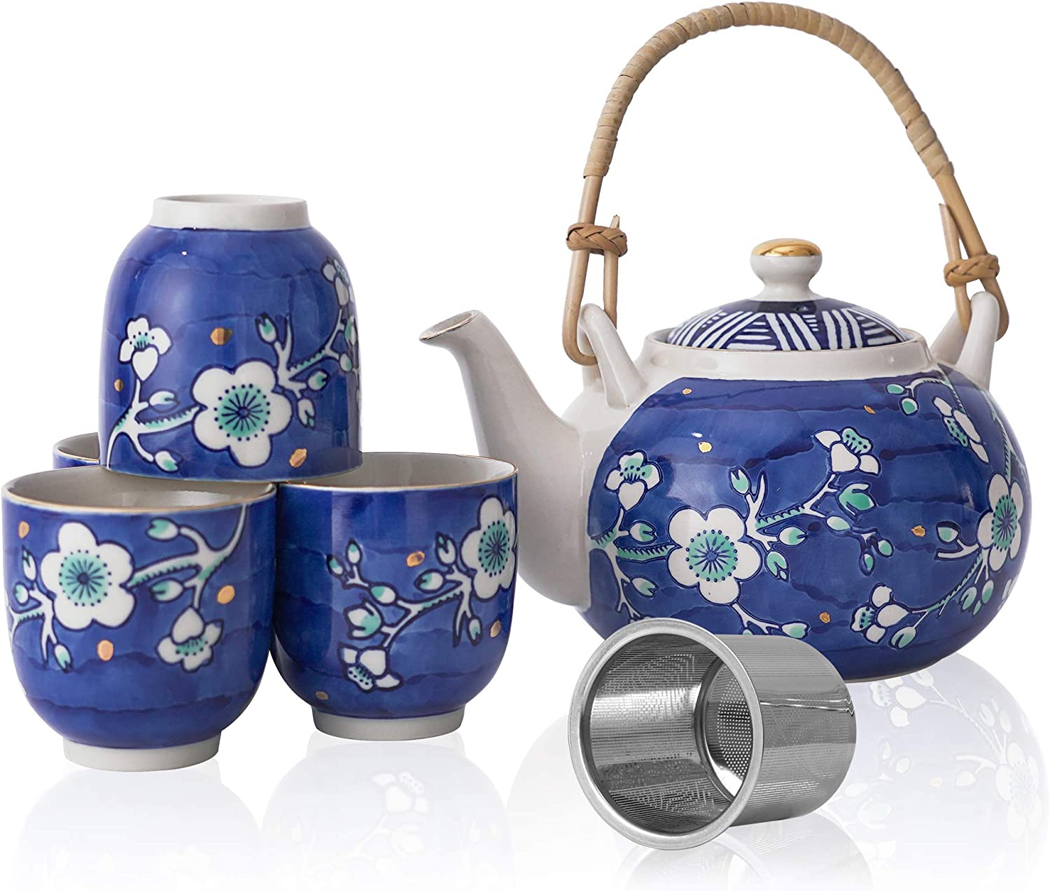 Cobalt Japanese Ceramic Tea Sets with 1 Teapot, 4 Tea Cups, Infuser, Tray