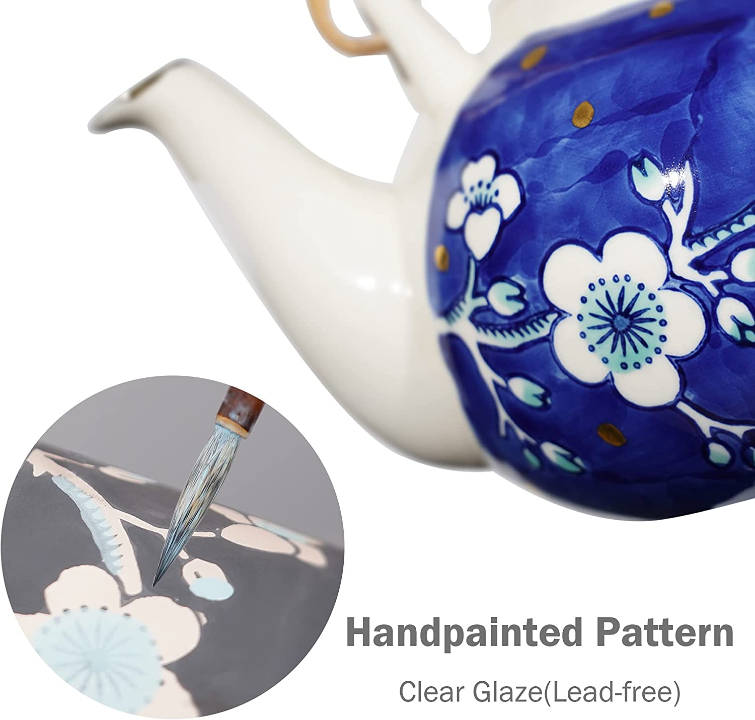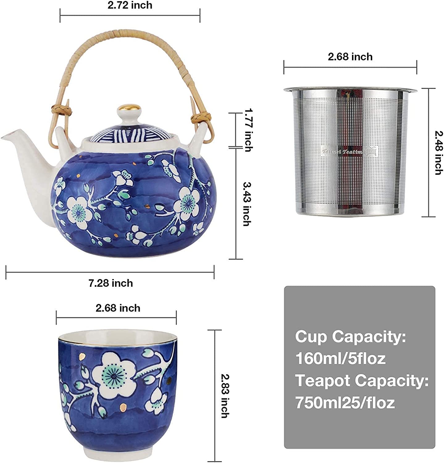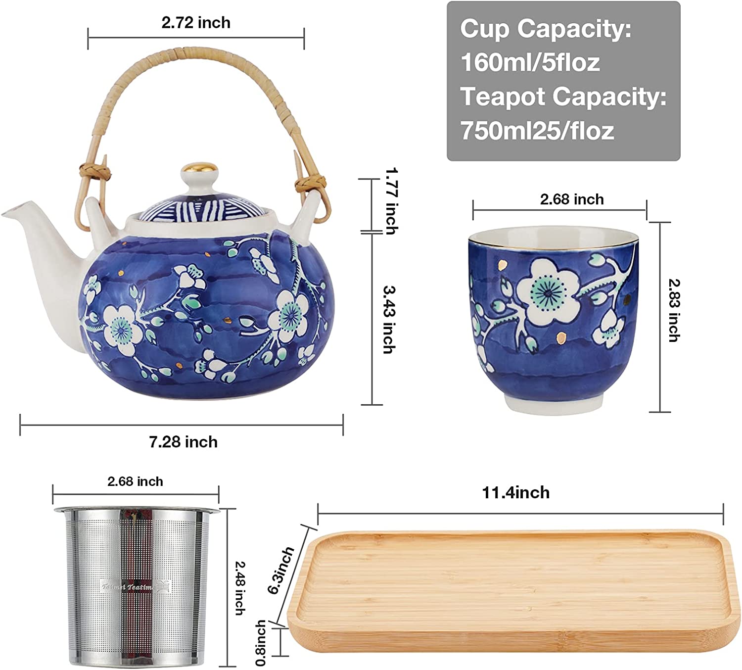 - Package Included - This tea set includes a 25 oz (730 ml) teapot with a stainless steel filter, four 5 oz (170 ml) tea cups, and a bamboo serving tray. Made of high-grade lead and cadmium-free ceramic, this tea set is healthy and durable for a long period.